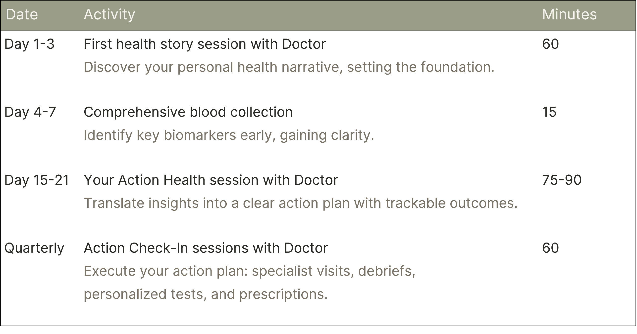Every experience is tailored to your age, health story, and lifestyle — focusing on the factors that matter most to your health. We partner with specialized labs and leading experts across multiple fields to ensure no aspect of your health goes unnoticed.